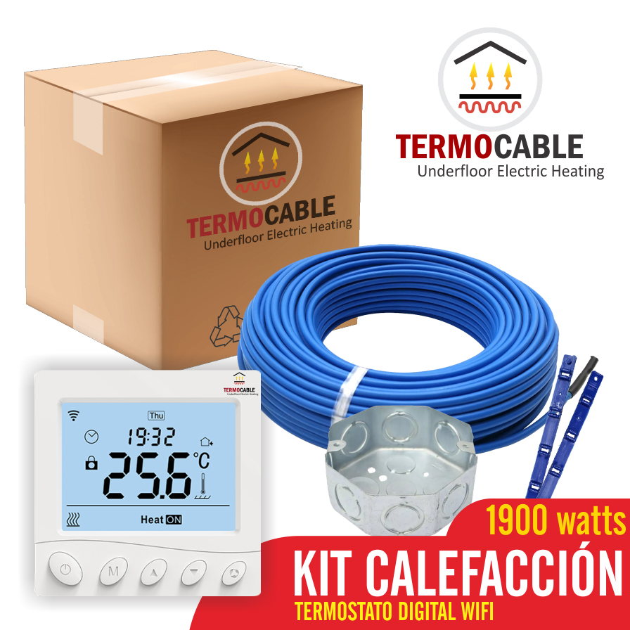 Kit de Cable Calefacción Eléctrica de 1900 Watts + Termostato Digital WiFi – Área de cubrimiento: 14.6 a 19m² – Instalación Fácil – Industria Argentina