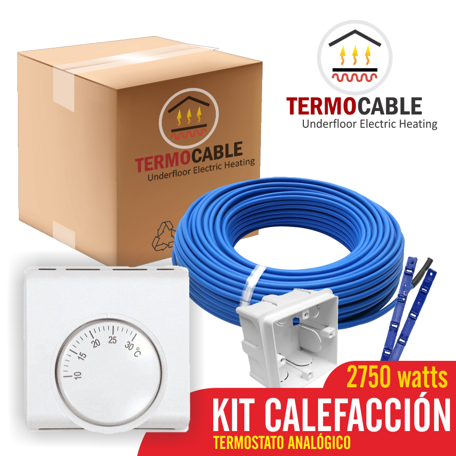 Kit de Cable Calefacción Eléctrica de 2750 Watts + Termostato Analógico – Área de cubrimiento: 21.2 a 27m² – Instalación Fácil – Industria Argentina